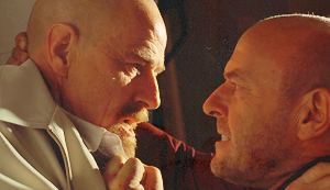 Il confronto tra Hank e Walt al termine dell’episodio `Blood Money` (`Denaro insanguinato`, 5×09) è una scena carica di una tensione quasi assurda, nella quale vediamo i due uomini studiarsi a vicenda al fine di comprendere quanto l’uno sappia dell’altro. È Walt a lanciare per primo il guanto di sfida, mostrando a Hank di aver scoperto il dispositivo di tracciamento sotto la sua auto in modo da indurlo a confessare i propri sospetti su di lui. È evidente come, in questo caso, la decisione più saggia sarebbe stata quella di continuare a fingere, eppure Walt non può resistere alla tentazione di mostrare al cognato quanto sia stato abile a superarlo in astuzia e in audacia. Per il momento, tuttavia, lo scontro tra i due sembra concludersi in nulla di fatto, essendo entrambi incerti su quale mossa sia opportuno compiere nell’immediato futuro.