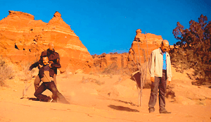 Evidente, innanzitutto, è l’influenza del cinema western post-classico, da cui la serie ricava gli scorci vasti e brulli, la fotografia calda e saturata, così come il senso di attesa e di annullamento metafisico nei confronti del paesaggio, rispetto al quale i personaggi vengono raffigurati in posizioni plastiche o emblematiche – si pensi al confronto fra Walt e Gus Fring in `Crawl Space`, oppure alla morte di Mike in `Say My Name` (`Di’ il mio nome`, 5×07), , esplicito omaggio a Sam Peckinpah e al suo `Pat Garrett e Billy The Kid`(1973). Altro punto di riferimento è il cinema di Sergio Leone, in particolare la pellicola `C’era una volta il West` (1968), da cui deriva la tendenza a giocare con le distanze tra gli oggetti e i personaggi, facendo collidere primi piani e campi lunghi o lunghissimi, passando dal mostrare panoramiche mozzafiato al ristringere l’inquadratura su dettagli apparentemente infinitesimali.
